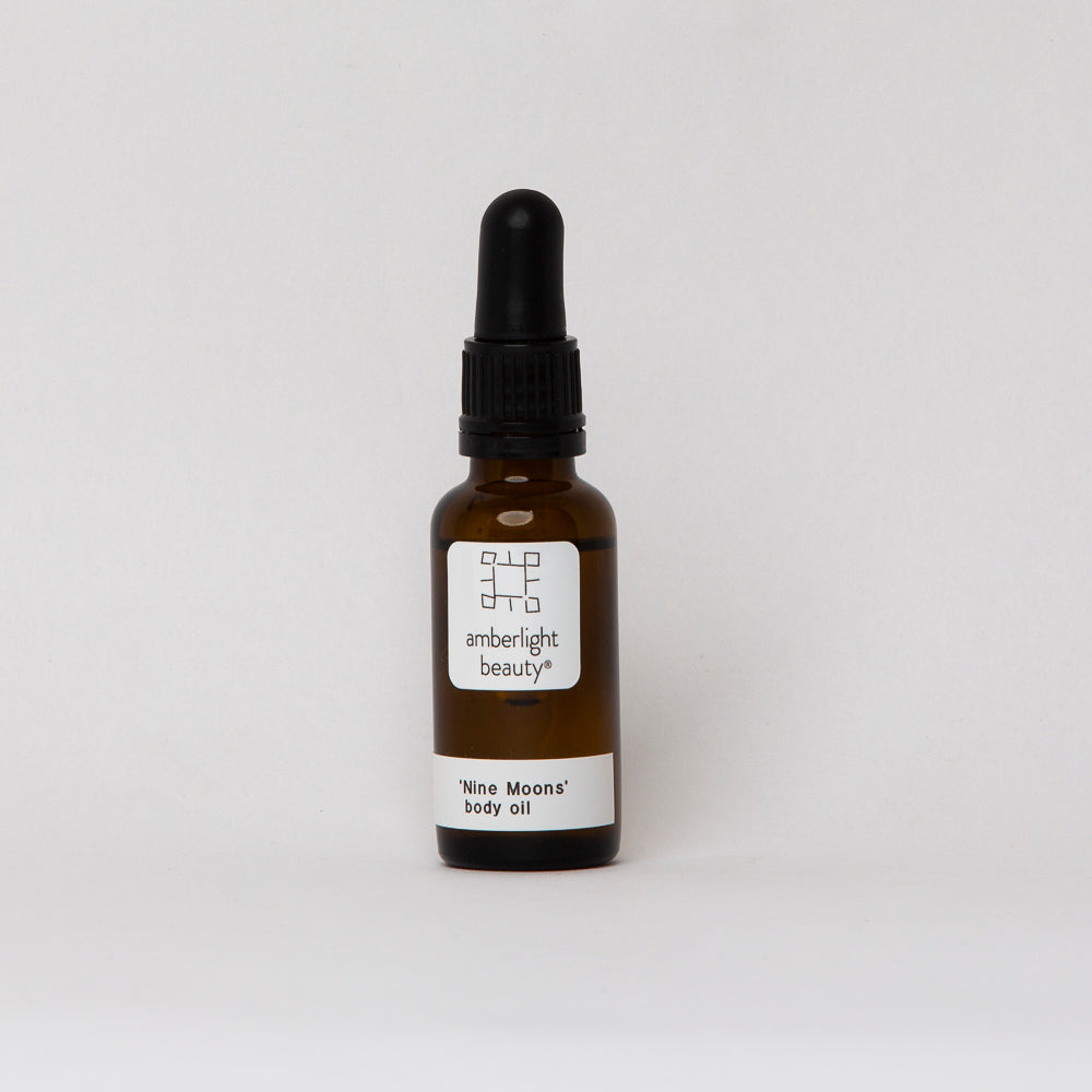 Amberlight Beauty "Nine Moons" Body Oil - Ingredients: Simmondsia chinensis (jojoba oil), Prunus armeniaca L. (apricot oil), Citrus aurantium Dulcis Peel Oil (sweet orange oil)*, Citrus Aurantium Amara Flower Oil (neroli oil), Tocopherols (vitamin E), Limonene**.