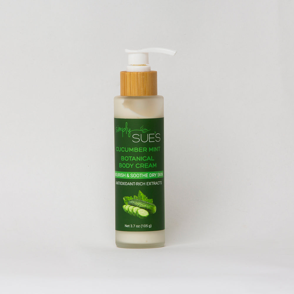 Simply Sue's Cucumber Mint Body Cream - A clean, botanical body cream infused with cooling cucumber and mint. Nourishes dry skin with a light, silky feel and a fresh scent that’s subtle and uplifting.